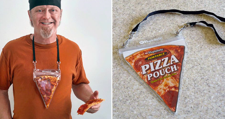 The Portable Pizza Pouch is a triangular ziplock bag on a string that stores an extra slice of pizza to wear around your neck. It keeps the pizza warm and fresh.