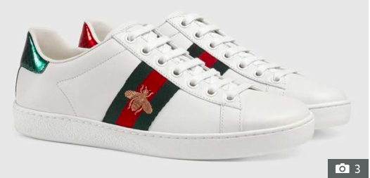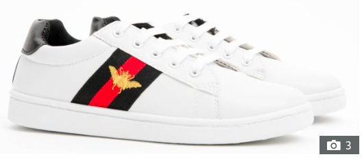 While Gucci’s signature “Ace” trainers feature green and red stripes, the bargain Poundland version features black and red, instead.