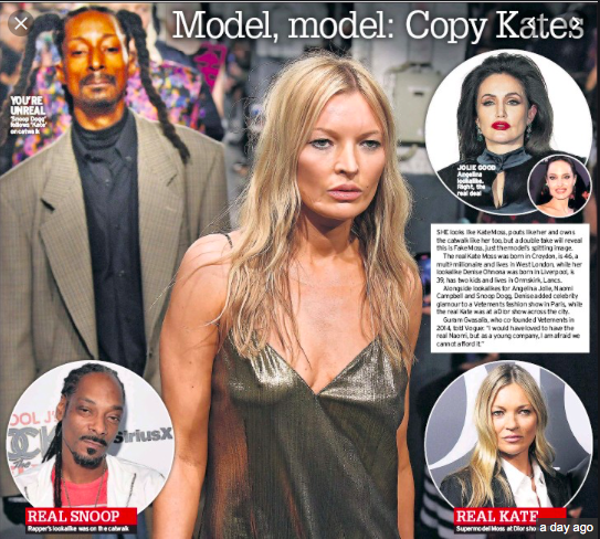 Denise Ohnona is a professional Kate Moss lookalike, and walked the runway for the Vetements fashion show. She looks like Kate Moss, pouts like Kate Moss and owns the catwalk like Kate too, but a double take reveals that she is nevertheless a “Fake Moss”.