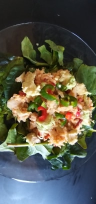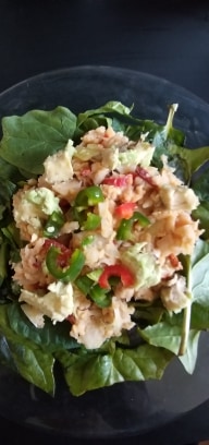 5) When cooked to taste ( another few minutes) serve it on the Spinach and top with the Avocado and in my case the rest of the Chopped Chillies.