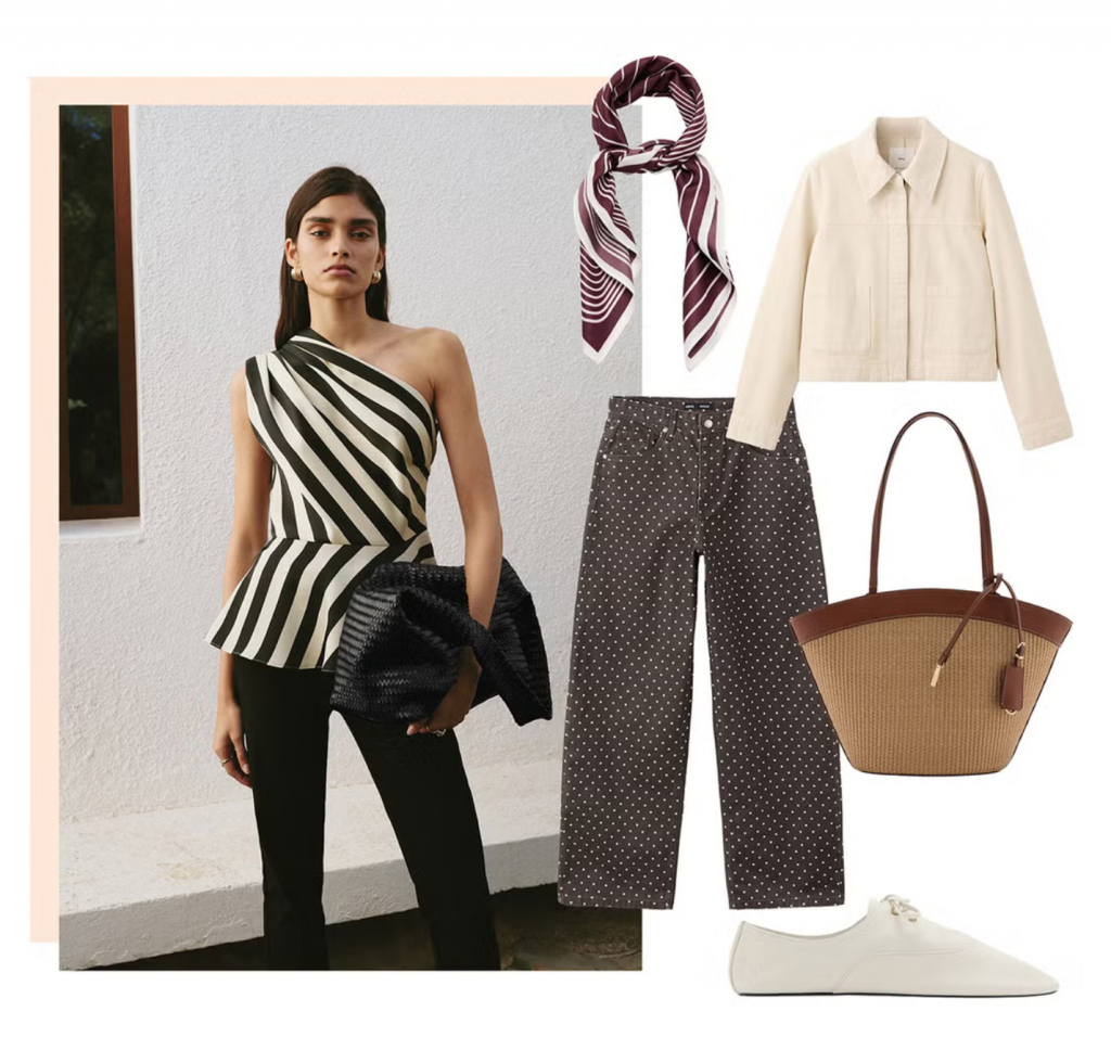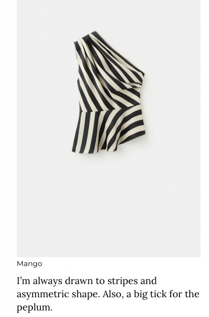 Highlights here are the polkadot barrel jeans (I love that they’re cocoa brown, which feels unexpected and softer than black), and also the striped peplum asymmetric top, which is gloriously bold but also quite classic. I’d pair it with black trousers and heels for the evening, but also with little shorts and flat sandals in the summer (and it goes without saying, it’s perfect with jeans).