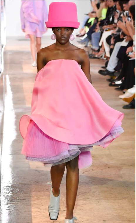 The bright pink bucket head was from the Nina Ricci spring and summer collection for 2020. The model wore a matching bright pink dress to go with it.