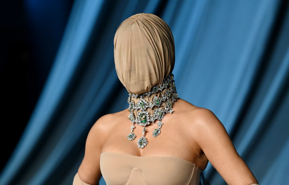 Kardashian recently attended an awards do, wearing a mask that wrapped around her entire head, with a silver and emerald choker necklace with pendants keeping it in place. The nude gown featured designed by sheer cups and an extreme, nipped-in waist and up-turned bodice, with sleeves that started at the elbows and billowed out to meet the flowing, draped skirt and train.