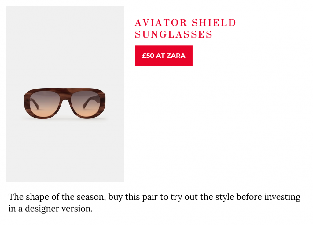 As the sun becomes stronger, I suggest buying a cheaper pair of sunglasses in a new style before you invest in the designer version – these aviator shields are the pair that caught my eye for the season ahead. Here’s my pick of the best wardrobe essentials from the Zara 2026 Spring drop.