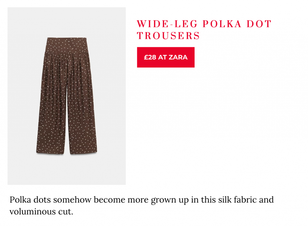 I generally steer away from too much pattern, but polka dots are a classic having a moment right now, and you could style this balloon skort with a crisp white shirt or a tee and black blazer to give it a sophisticated spin. The same with these wide leg trousers, which balanced with a knitted tank or turtleneck, bring just the right amount of Spring Season energy.